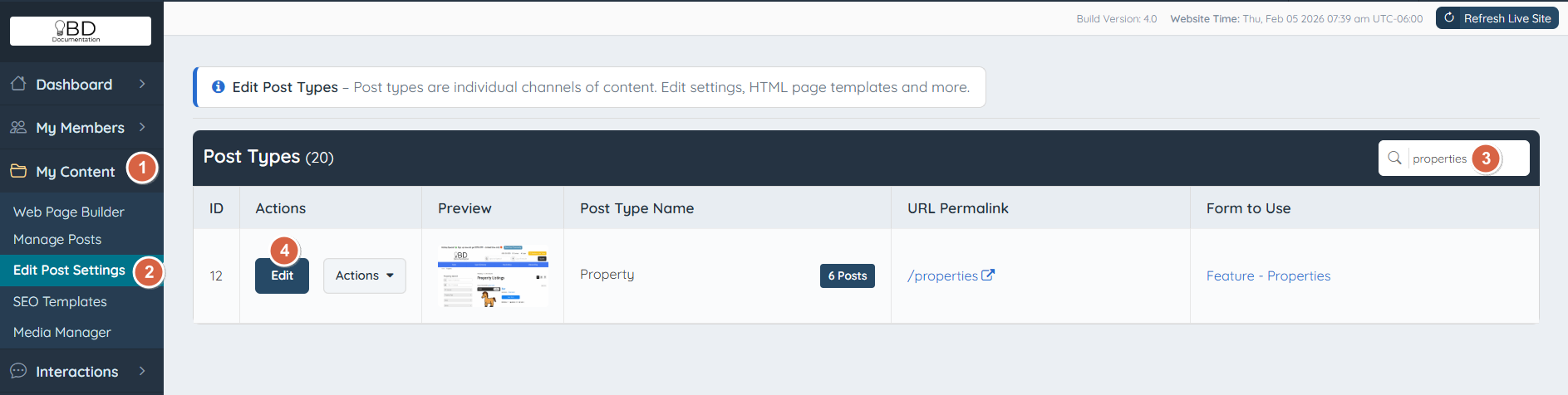 - Use the Post Type search tool to locate the specific Post Type or scroll down to the desired entry.