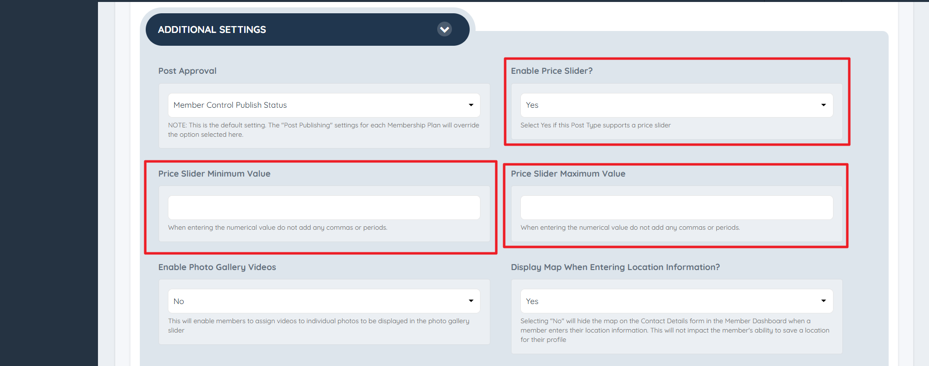 Within the General Settings tab, scroll down to Additional Settings to locate the Price Slider fields.