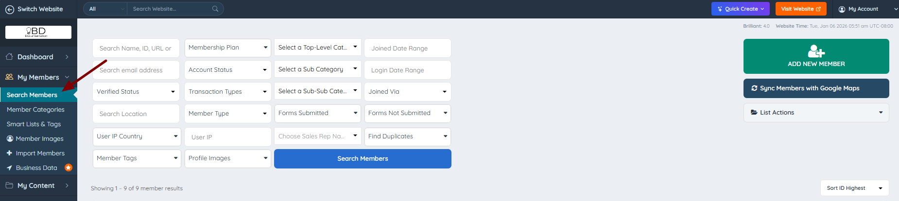 1. Log in to the Admin area and navigate to Members >> Search Members :