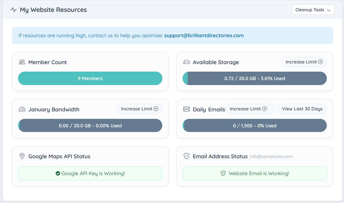 The Admin Dashboard has a section called "My Website Resources" which gives a high-level overview of the resource usage of the site for the current calendar month. The bandwidth used so far this month can be seen here: